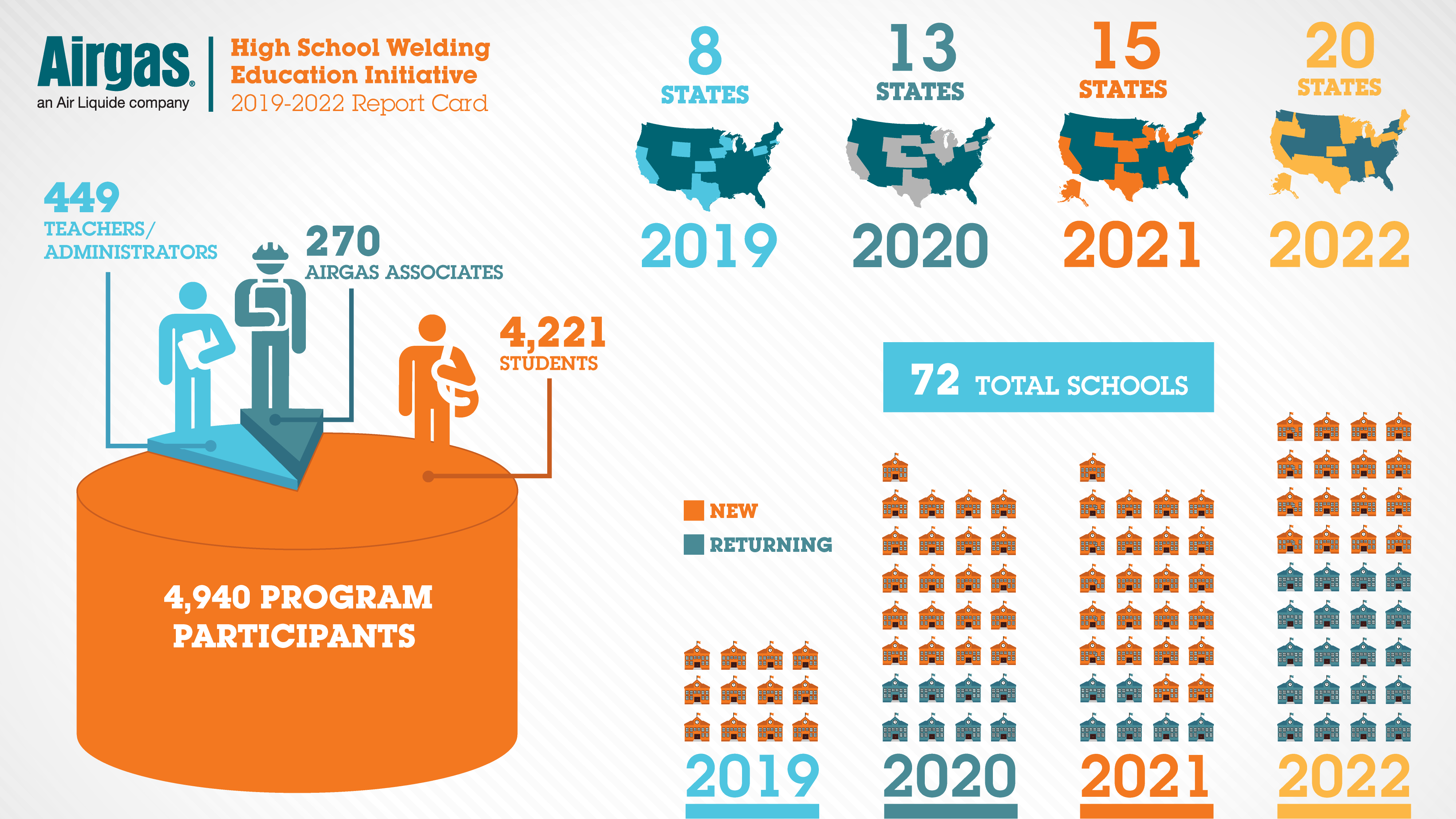 The American Welding Society (AWS) forecasts that 336,000 new welding professionals are projected to be needed by 2026, with 84,000 average welding jobs to be filled annually between 2022-2025. Since 2018, Airgas has assisted 72 schools, 4,200 welding students and nearly 450 instructors across the country. In the past two years combined, more than 250 students obtained welding jobs directly after graduating from a school program supported by Airgas donations.